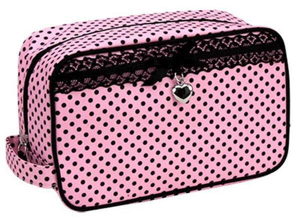 A medium sized, rectangular shaped, zip top toilet bag that has small, black polka dots, black lace trimming and a metal heart shaped charm