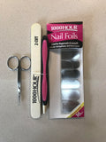 1000 Hour Nail Foil packet of 16 -Black Florentine print. Stays on for 1000 hours. Self adhesive. Plus manicure set. comes with nail scissors, hot pink nail file and a hot pink plastic and cuticle rubber stick. Amazing value. Last left in NZ