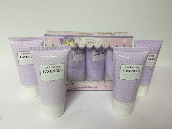 This kit features 4x50ml bottles of different types of lavender scented body care. This includes: shower gel, cream body foam, body scrub and a body lotion.