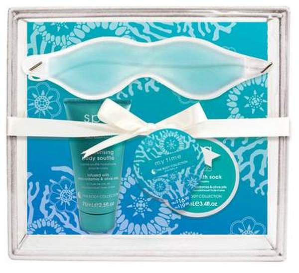 A square metal framed box with clear PVC covering and a sea blue background containing 3x products: a gel eye mask, a 75ml bottle of moisturising body souffle and a 120g circular container of aquatic bath soak