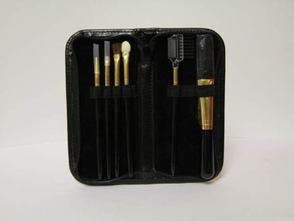 These 6 Makeup brushes come in a zip up black purse / makeup case. This kit features a: powder brush, eyebrow groomer, 2 eyeshadow brushes and 2 eyeliner or lip brushes.