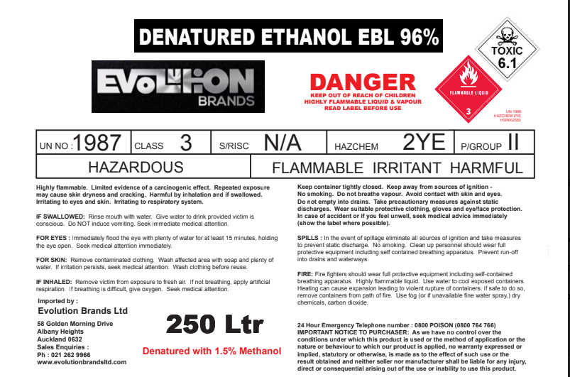 Ethanol 96% Denatured 250l drum (3 in total)