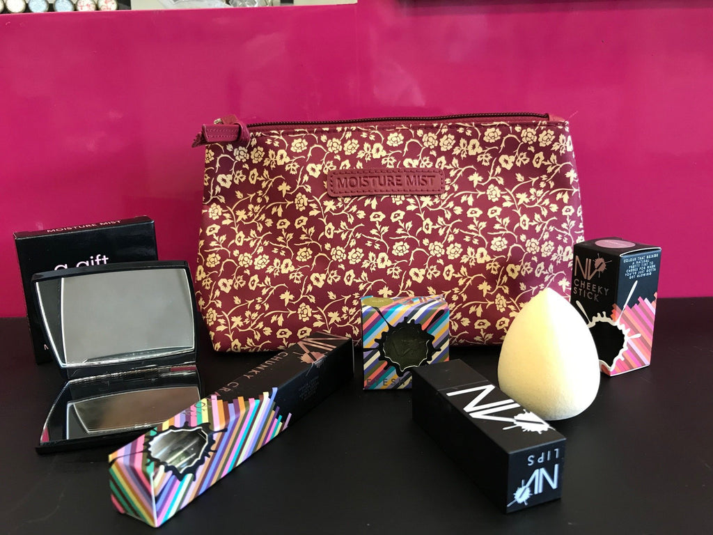 7 piece set, includes moisture mist pink makeup bag, blusher, eye shadow, lipstick, eye crayon, beauty blender and moisture mist mirror compact