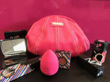 7 piece set, includes moisture mist pink makeup bag, blusher, eye shadow, lipstick, eye crayon, beauty blender and moisture mist mirror compact